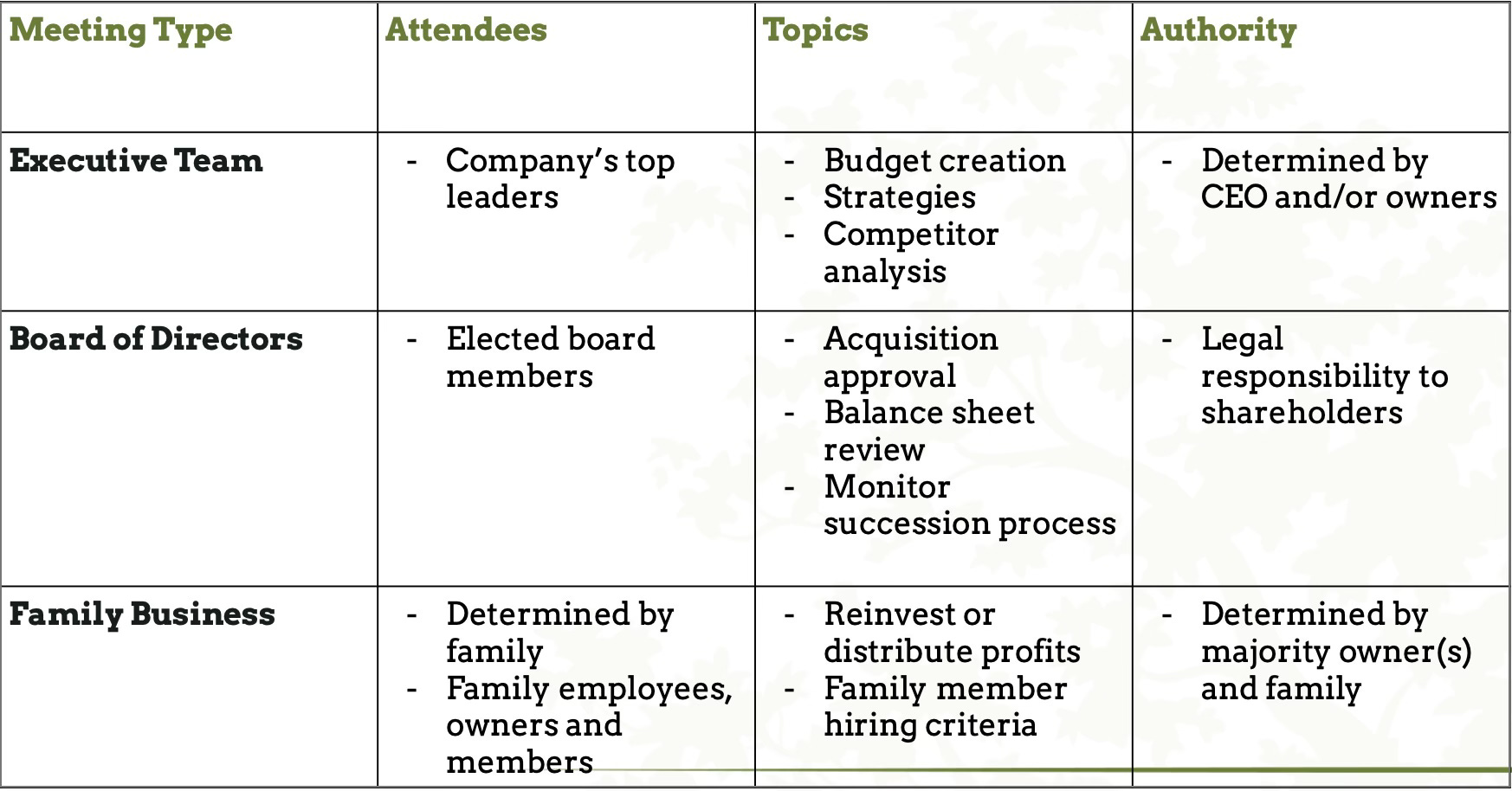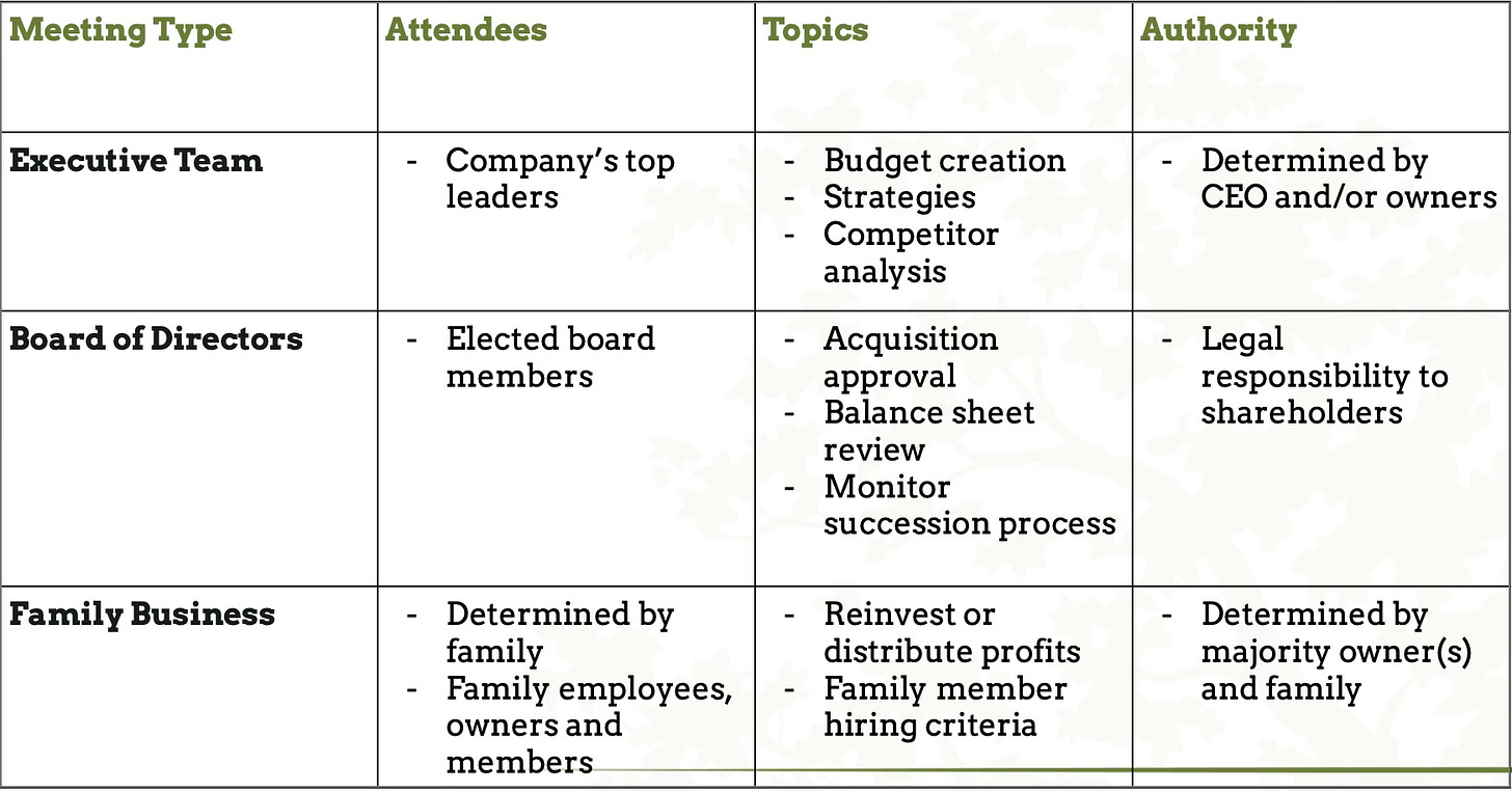 Note that each meeting has distinct attendees, topics and authority. In a family company, you likely have overlap between the meetings - two family members may take part in all three meetings, and a couple may participate in just one type.